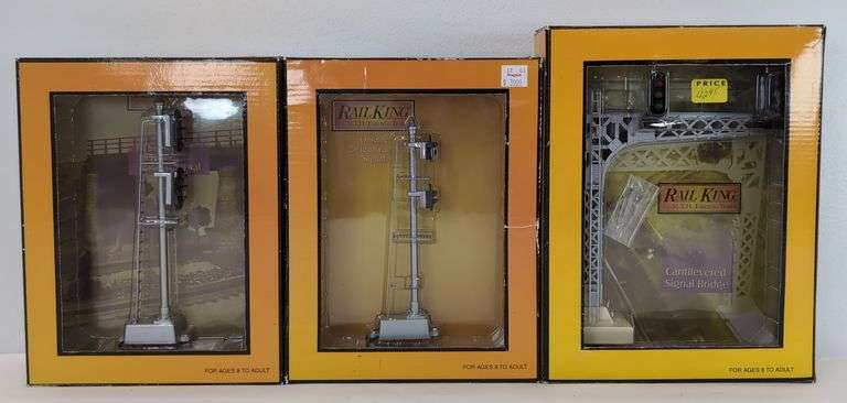 MTH Rail King 30-11009 cantilevered signal bridge, 30-11024 3 over 3 vertical signal, 30-11035 2-head target signal in original boxes, displayed/operated C8. Boxes show little to light wear, bright, clean, square and solid.