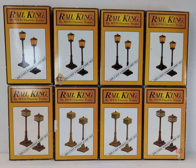 MTH Rail King O Gauge street lamp group; four MT-1027 maroon No. 56, two MT-1028 yellow No. 57 and two MT-1029 orange No. 57, in original boxes. Items have been displayed/operated C7-8. Boxes show little to light wear, mostly surface wear to corners and edges, some price stickers. Boxes are bright, clean, square and solid with good styrofoams.