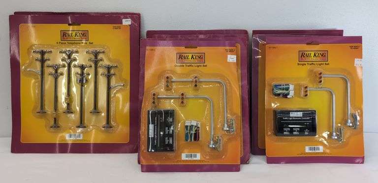MTH Rail King O Gauge two 30-1088 6 piece telephone pole sets, four 30-1089-1 single traffic light sets, four 30-1089-2 double traffic light sets, layout accessories Mint On Card, C9-10. Packages are factory sealed, some cards have been cut down on both sides, some price stickers, etc.