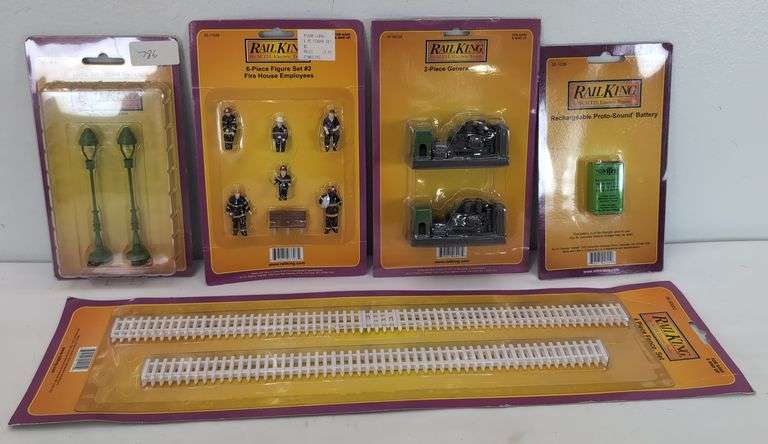 MTH Rail King O Gauge 30-50002 4-piece fence set, 30-11046 6-piece figure set #2 fire house employees, 50-1008 Rechargebale Proto-Sound Battery, 30-50028 2-piece generator set, 30-11033 O Lamp Set street gas light set, Mint On Card factory sealed C9-10. Cards and covers show little to light wear, some price/inventory stickers, etc. Bright, clean, solid.