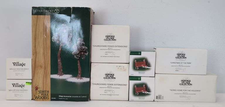Ten Dept. 56 items including; benches, fences, railroad figures, sitting figures, large pinewood trees all in original packages, displayed C8. Packaging shows little to light wear.