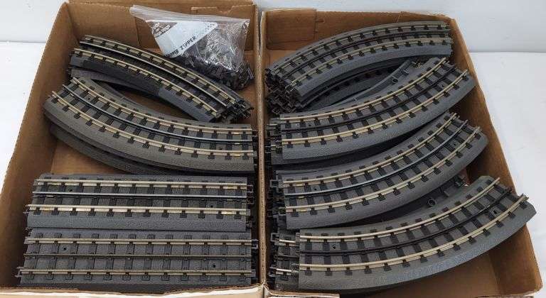 Group of MTH Rail King O Gauge RealTrax straight (eleven sections) and curved (thirty-three O-31, one O-42), C6-7. Some track sections have some rust and or tarnish/oxidation one straight has layout paint. No damage noticed, fairly clean.
