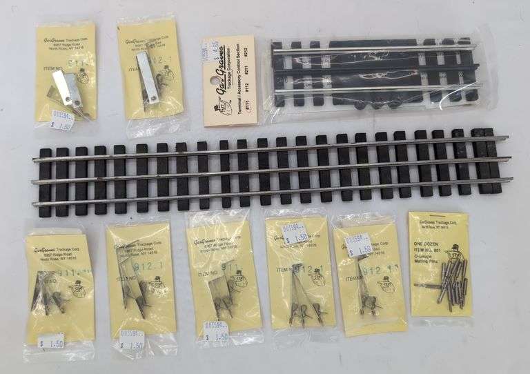 Gar-Graves O Gauge; 111 accessory control section, 801 mating pins, three 911 connectors, four 912 connectors in factory sealed packages, C9-10. 14-3/4" straight section of track, loose starting to tarnish in a couple spots, easily cleaned.