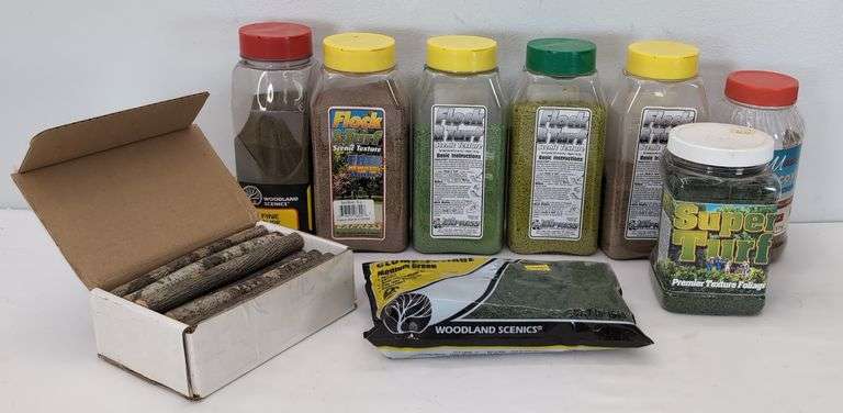 Woodland Scenics, Scenic Express, Scene Master layout scenery making materials, in original containers. Woodland Scenics FC683 clump-foilage factory sealed bag. Woodland Scenics T1342 Fine Truf earth, mostly full. Scene Master Ground Cover mixed lychen, about half full. Five Scenic Express containers with various material, one less than half full, rest mostly full. Small box of very neatly cut logs, very very clean, loose. Nice clean useable lot of layout scenery construction materials. Please view all of our photos very carefully for the best description, condition and quantities.