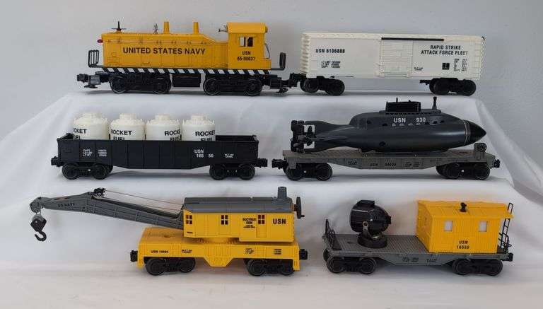 Lionel O Gauge USN diesel switcher freight set, locomotive unit and five cars, set number 11745. Trains look C7. No box, no instructions, no literature.
