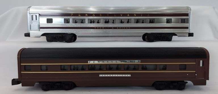 Lionel O Gauge 15" aluminum PRR Thomas A. Edison coach and an un-marked/un-numbered Pennsylvania Congressional coach, passenger cars. Lionel train looks clean and shiny C7. Other train has nuts and bolts holding ends to frame, looks C7.