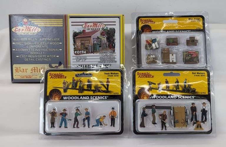 Bar Mills Scale Model Works 0194 Hinkle's Package Store kit, unassembled open box kit C9. Woodland Scenics Scenic Accents A2723 Track Workers, A2747 Rail Workers and A2766 Misc. Freight, scenery figures in factory sealed packages, C9-10. Bar Mills box shows little wear, bright, clean, square and solid. Woodland Scenics packages show little wear, clean and solid.